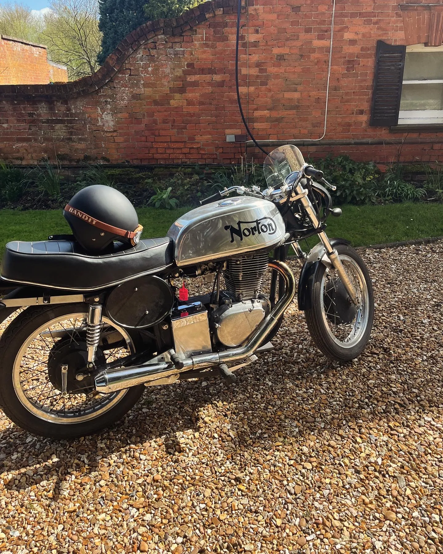 The original belt drive Suzuki Savage motor has been geared up by around 20% to give the high-geared feel of a Goldie and the steering precision of the featherbed has been retained because the fork and yoke geometry is a close match to the proper Norton Roadholders.