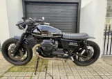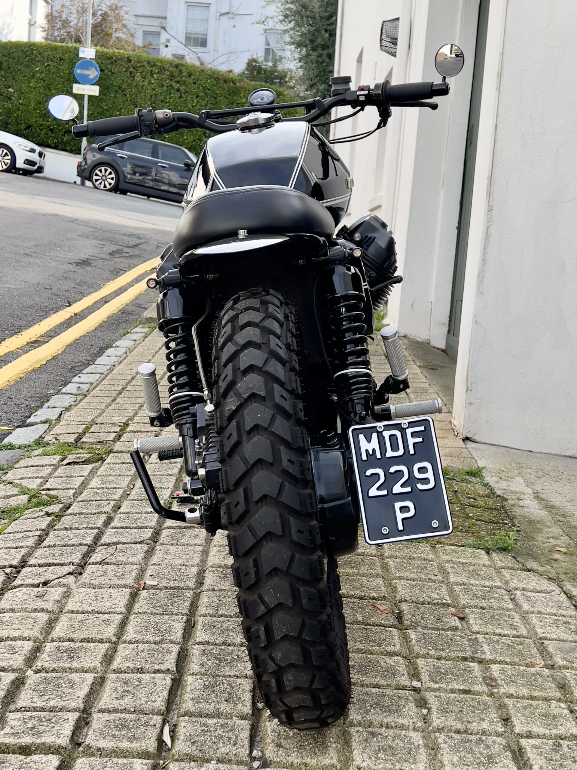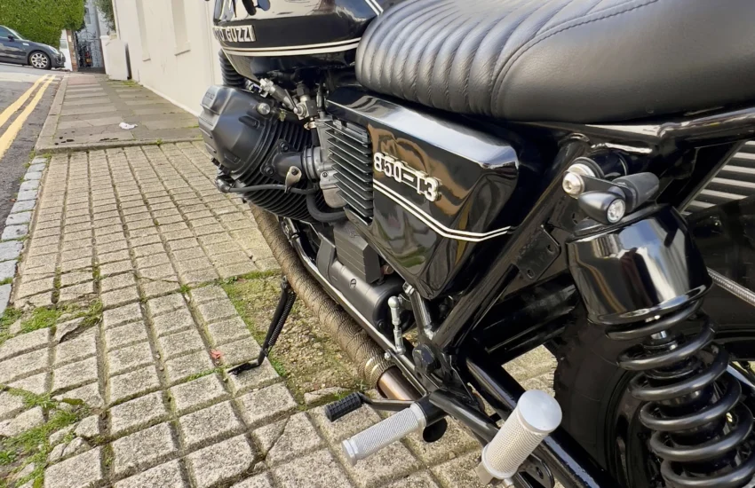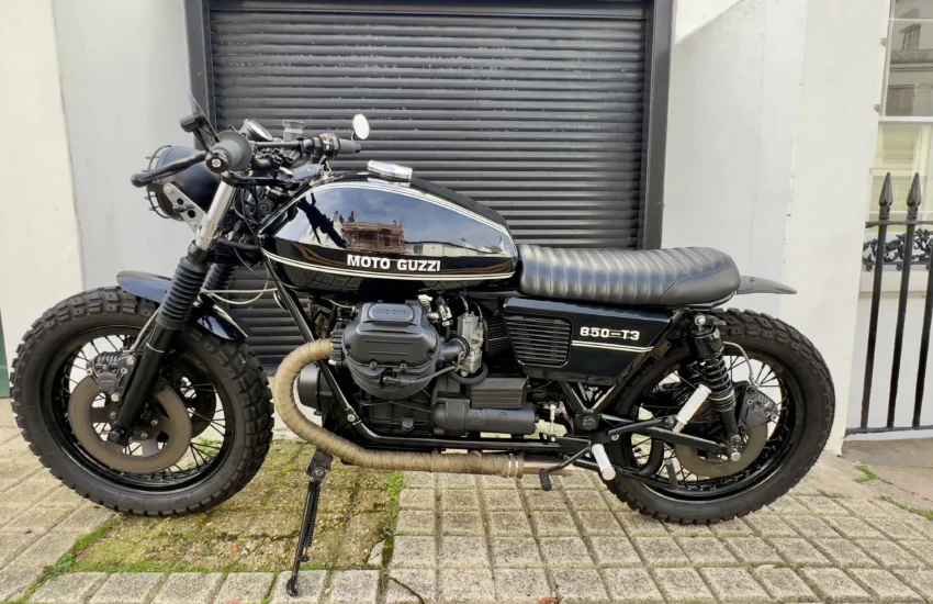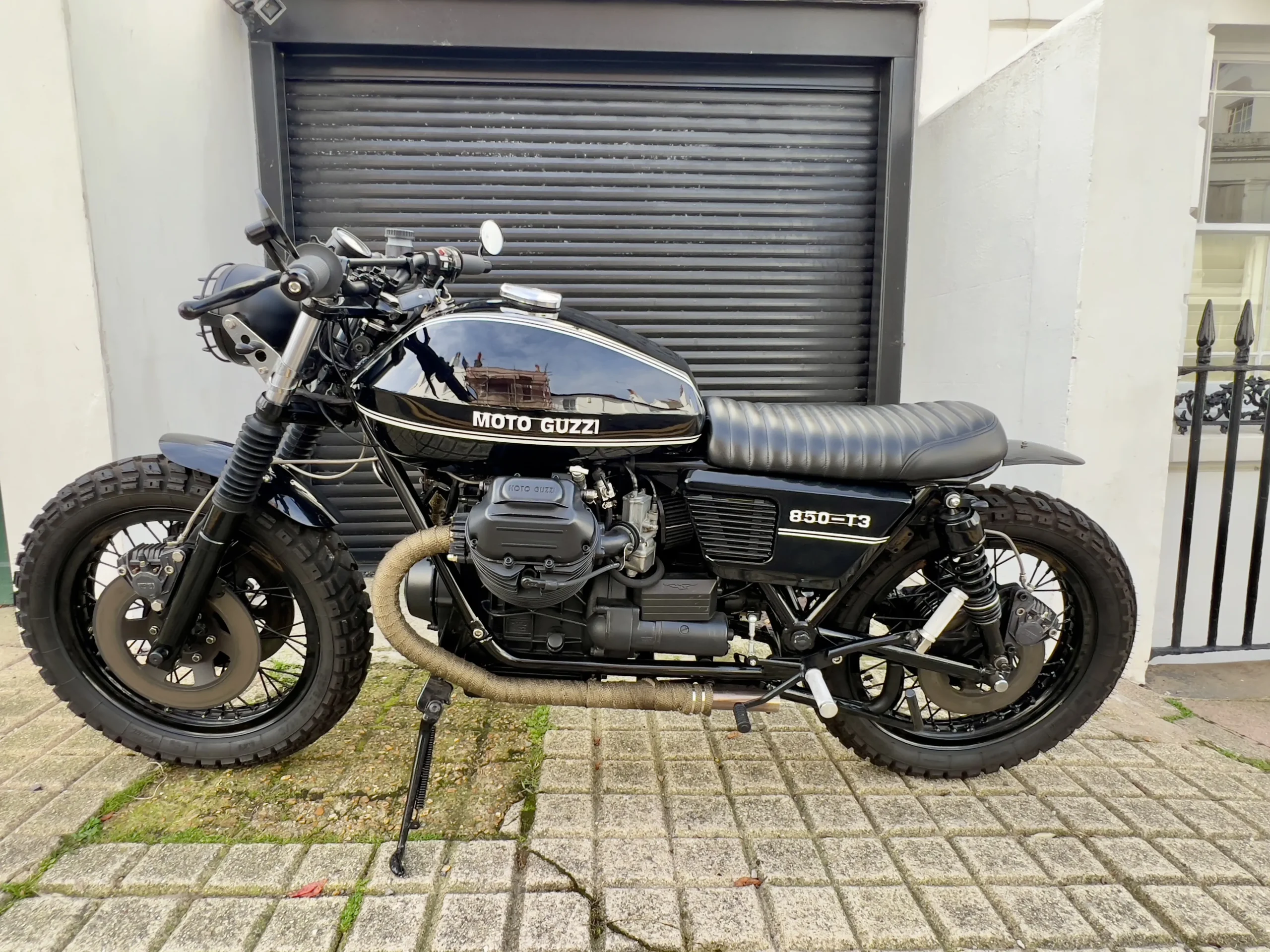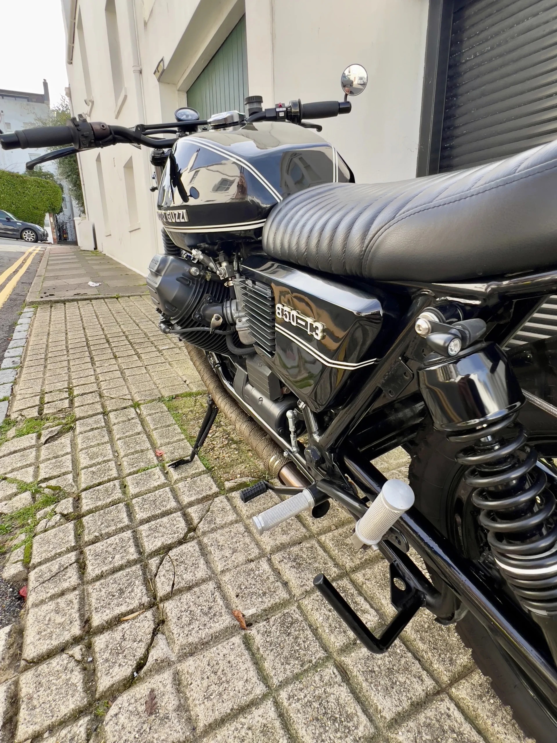 A true Italian classic with modern upgrades. Original matching-numbers V-twin and Tonti frame paired with tasteful custom work: twin wrapped exhausts, shortened tail with custom seat, upgraded rear shocks, LED lighting, Daytona speedo, scrambler bars, Heidenau K60 tyres, and tidy side-mounted plate. Still proudly finished in Guzzi Black with restored decals and hand-painted pin-striping.