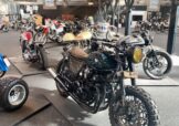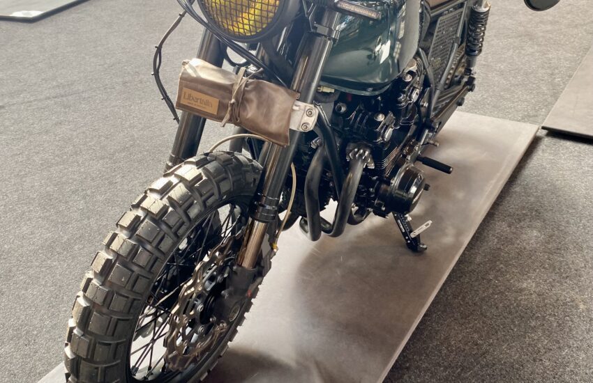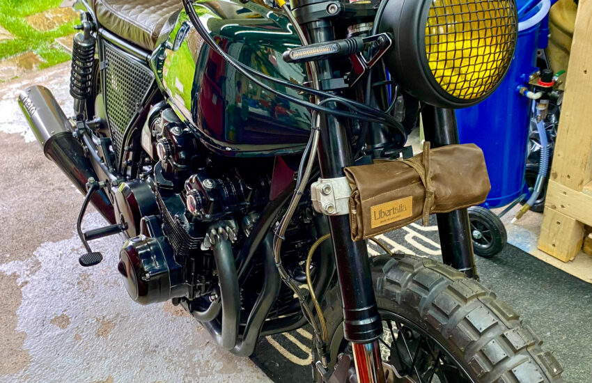 The bike had a full bottom and top end engine rebuild, NWT electrics, new front/rear lights, GSXR front end with a new spoked wheel by BSpoke Wheels (twin discs), a rear spoked wheel from a later CB, a British Racing Green tank painted by Valkyrie Paintworks, handcrafted rear cowl, side panels, Neta exhaust and a bespoke leather seat.