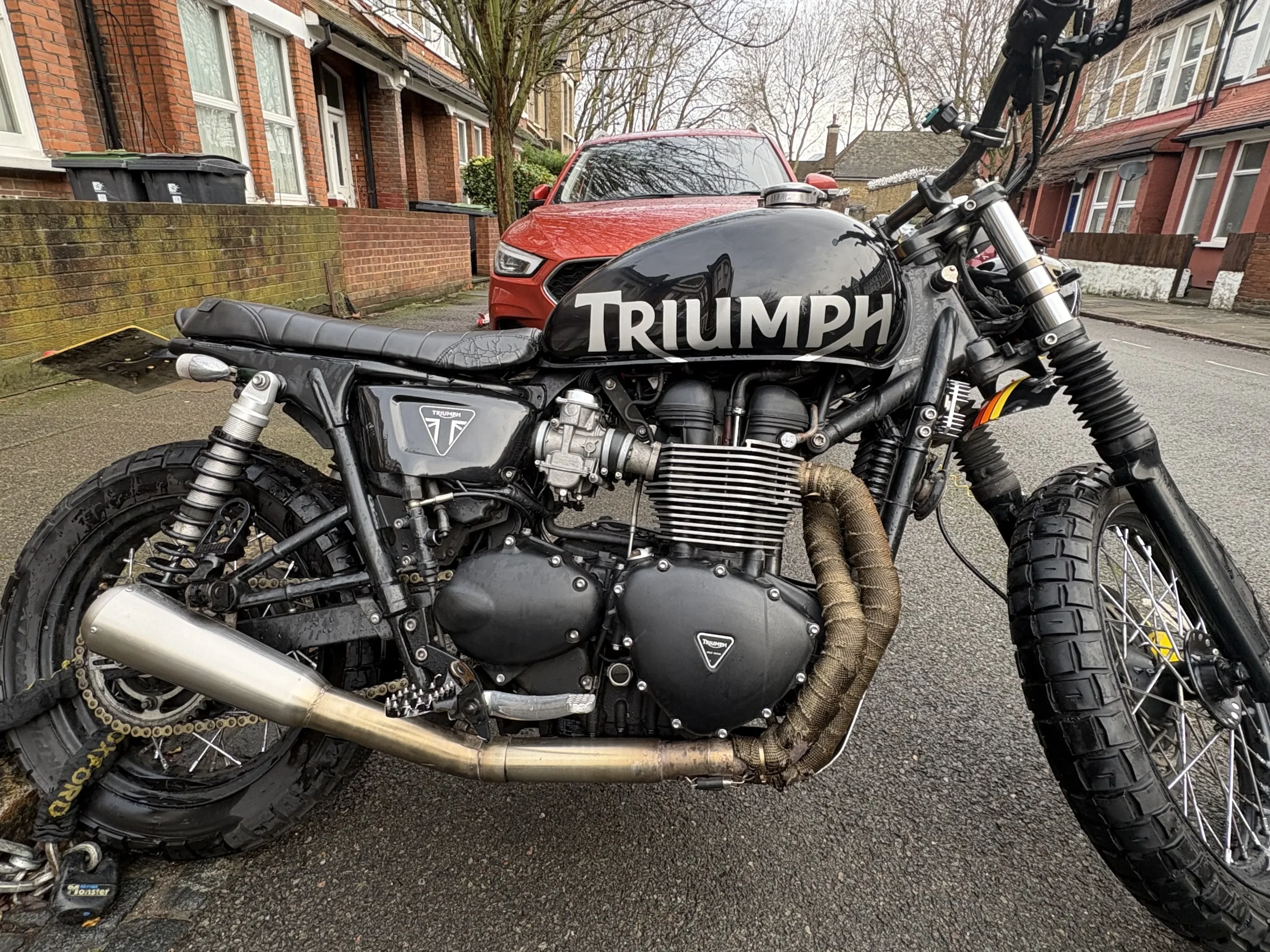 A very much loved bonneville, used daily for my commute, currently 28,517miles but will go up 30miles per week until sold. In good condition for age and milage,new electrics installed in October , so many extras including bates rear light, short rear fender, BAAK 2Win rear shocks, Pirelli scorpion rally str tyres, short seat (1 black, 1 brown) mini side panels, DNA high performance air filter, 2 into 1 TEC exhaust, original graphics on tank, bear claw pegs, alloy headlight brackets, high level front fender, probably other bits i have missed. full service history, next MOT in march but happy to get a new one with the sale if required.