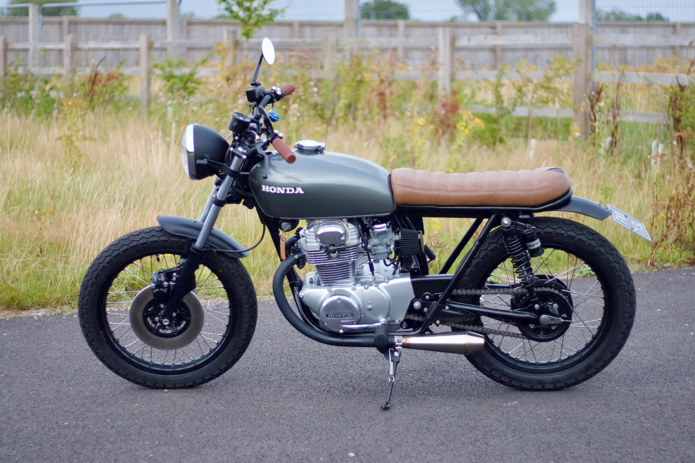 Restored summer 2024, this immaculate 1973 CB350G has been fully customised. The original bike had 6000 miles and was in great condition. The frame has been professionally modified to include a seat loop and is freshly powder coated in satin black. The forks have been serviced and rebuilt with new stanchions and the rear suspension is brand new. The wheels have been rebuilt with new spokes on new lighter aluminium rims with the original hubs powder coated. The wiring loom is completely custom and terminates to a Purpose Built Moto Black Box in a custom low profile battery tray creating the clean look. A combined solid state regulator rectifier has also been installed. Switch gear and indicators are provided by Purpose Built Moto along with the exhaust headers and the cockpit look is completed by a new minimal speedometer. All lights are LED allowing for a smaller battery and clean look. The seat is custom made and trimmed in brown leather by Calulfield Leather and is very comfortable. The fuel tank has been refurbished and painted in classic Porsche granite green metallic. The engine has been rebuilt with all new hex bolts replacing the JIS screws, all new gaskets and given a fresh coat of silver paint.