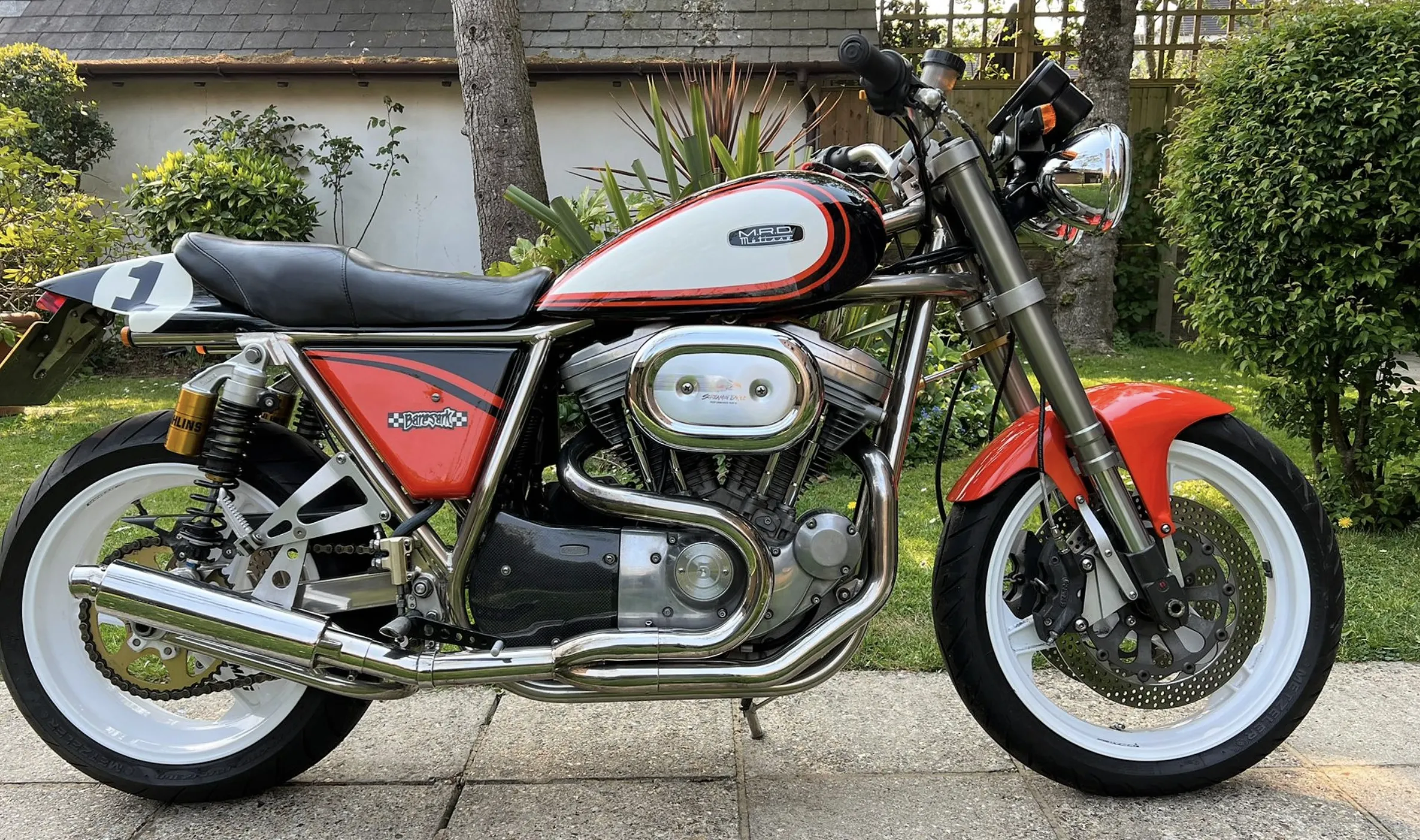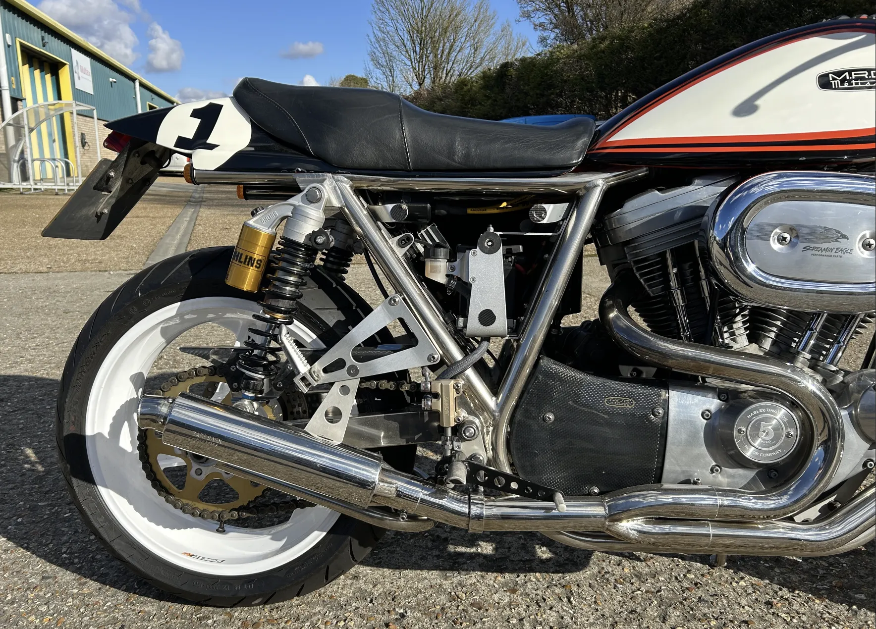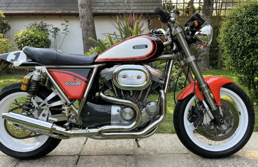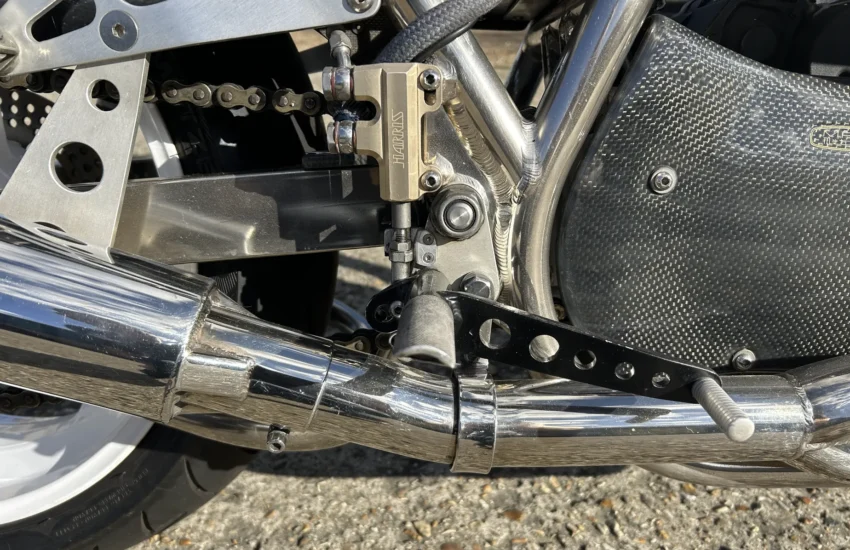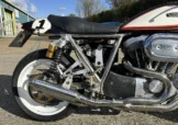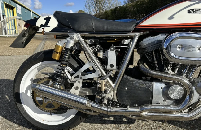 Built by Pat French and Mark Jannink of MRD Metisse in Bristol, ‘T41 TEU’ was registered as a Metisse with a year-related registration number in 1999. Based around the MRD nickel-plated chrome moly oil-bearing frame and swingarm, this example has benefited from the very best components in the build. The 1198cc Sportster Evo engine was converted to chain drive with mild tuning for reliability. Spondon engineering provided the 54mm White Power Roma fork legs along with the adjustable yokes. Spondon also provided the 4 pot front brake callipers and brackets and the 320mm brake discs. The wheels are Dymag Classic H Section with cush drive. There’s a WP 5140 Steering damper, carbon fibre tail unit and side panels, engine sprocket cover and chain guide, alloy Pearson petrol tank, Ohlins adjustable rear shock absorbers, headlamps from a Triumph T509, an upholstered leather hide seat, a custom-built exhaust system (very quiet) and an Elliot tachometer and RGV 250 speedometer paired-up perfectly in their custom housing. Paintwork was done by Andy at Ultimate Bike Paint. Owned in the same family since new, the bike handles very well with quick but stable handling.