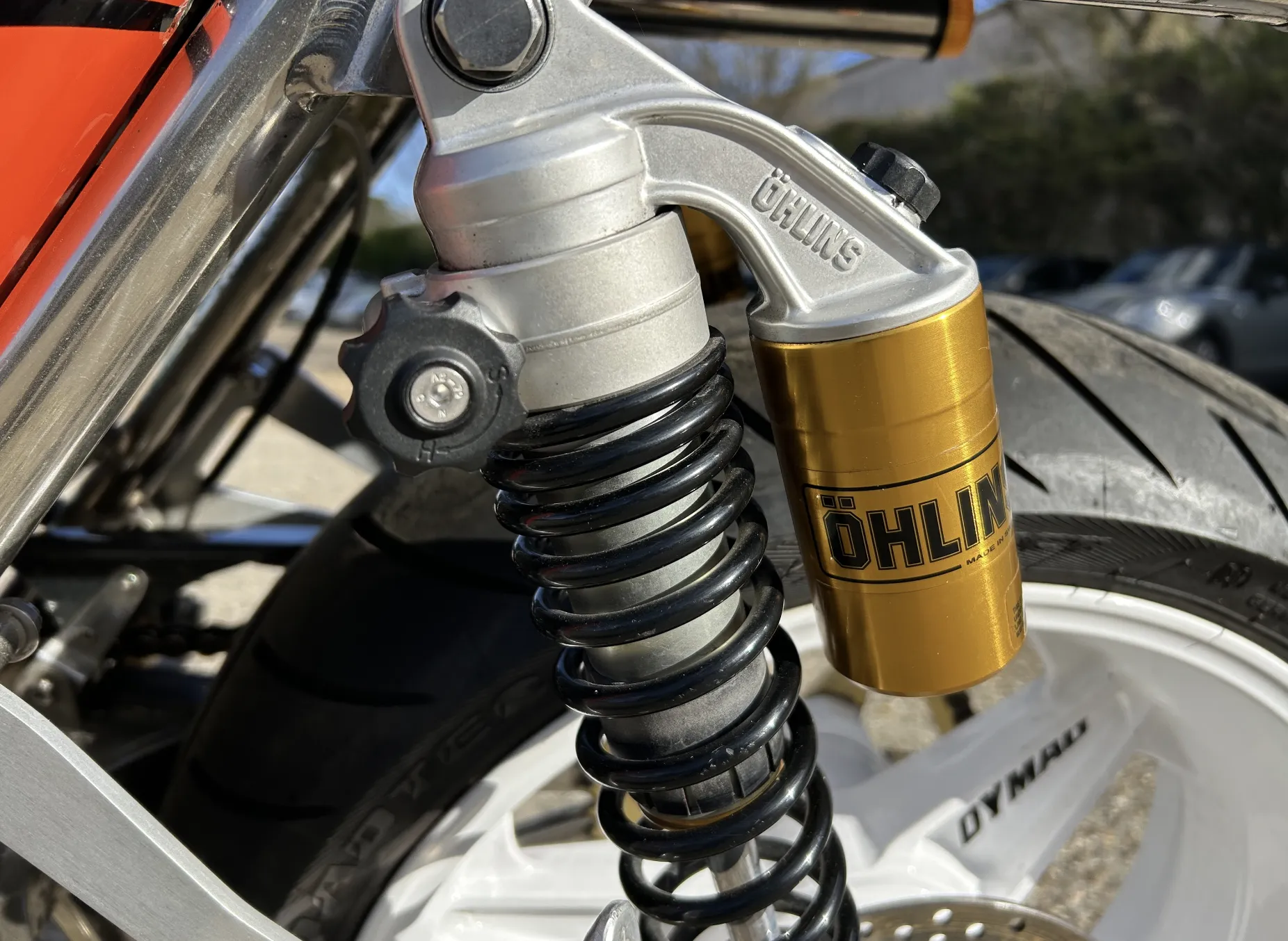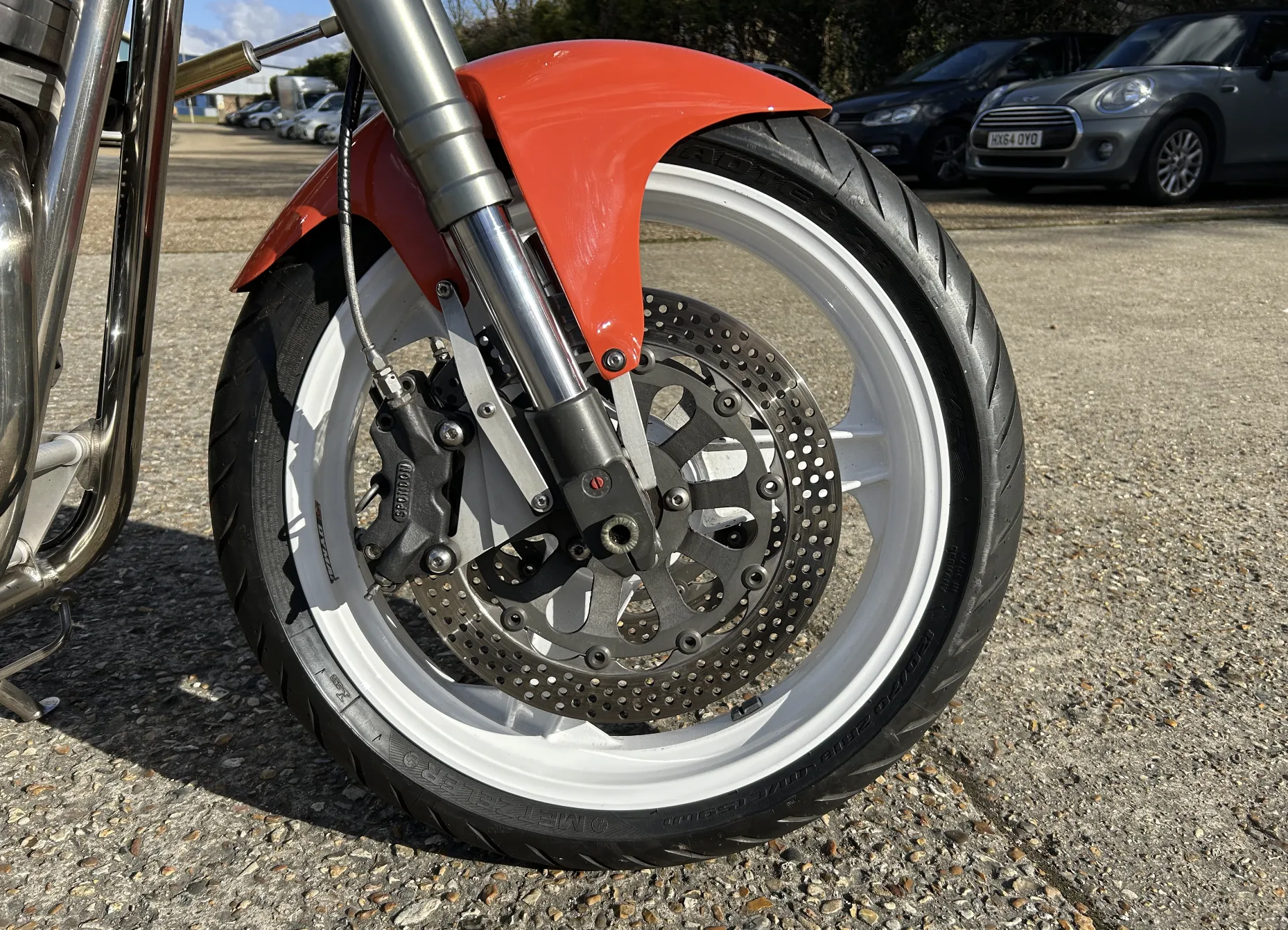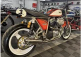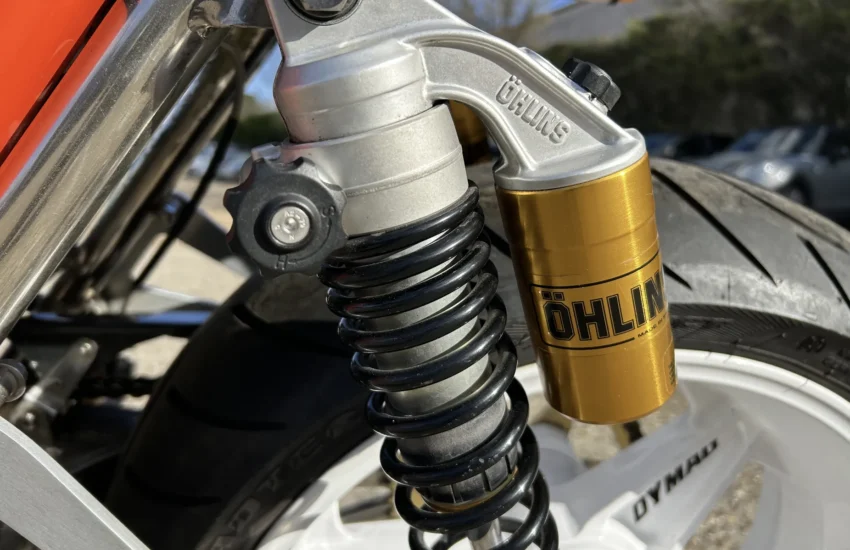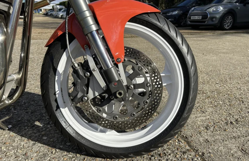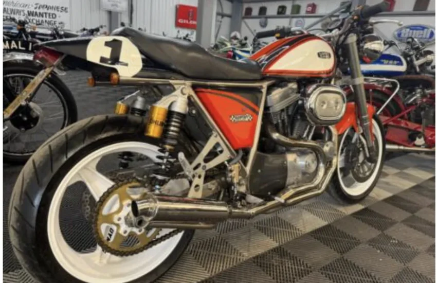 Built by Pat French and Mark Jannink of MRD Metisse in Bristol, ‘T41 TEU’ was registered as a Metisse with a year-related registration number in 1999. Based around the MRD nickel-plated chrome moly oil-bearing frame and swingarm, this example has benefited from the very best components in the build. The 1198cc Sportster Evo engine was converted to chain drive with mild tuning for reliability. Spondon engineering provided the 54mm White Power Roma fork legs along with the adjustable yokes. Spondon also provided the 4 pot front brake callipers and brackets and the 320mm brake discs. The wheels are Dymag Classic H Section with cush drive. There’s a WP 5140 Steering damper, carbon fibre tail unit and side panels, engine sprocket cover and chain guide, alloy Pearson petrol tank, Ohlins adjustable rear shock absorbers, headlamps from a Triumph T509, an upholstered leather hide seat, a custom-built exhaust system (very quiet) and an Elliot tachometer and RGV 250 speedometer paired-up perfectly in their custom housing. Paintwork was done by Andy at Ultimate Bike Paint. Owned in the same family since new, the bike handles very well with quick but stable handling.