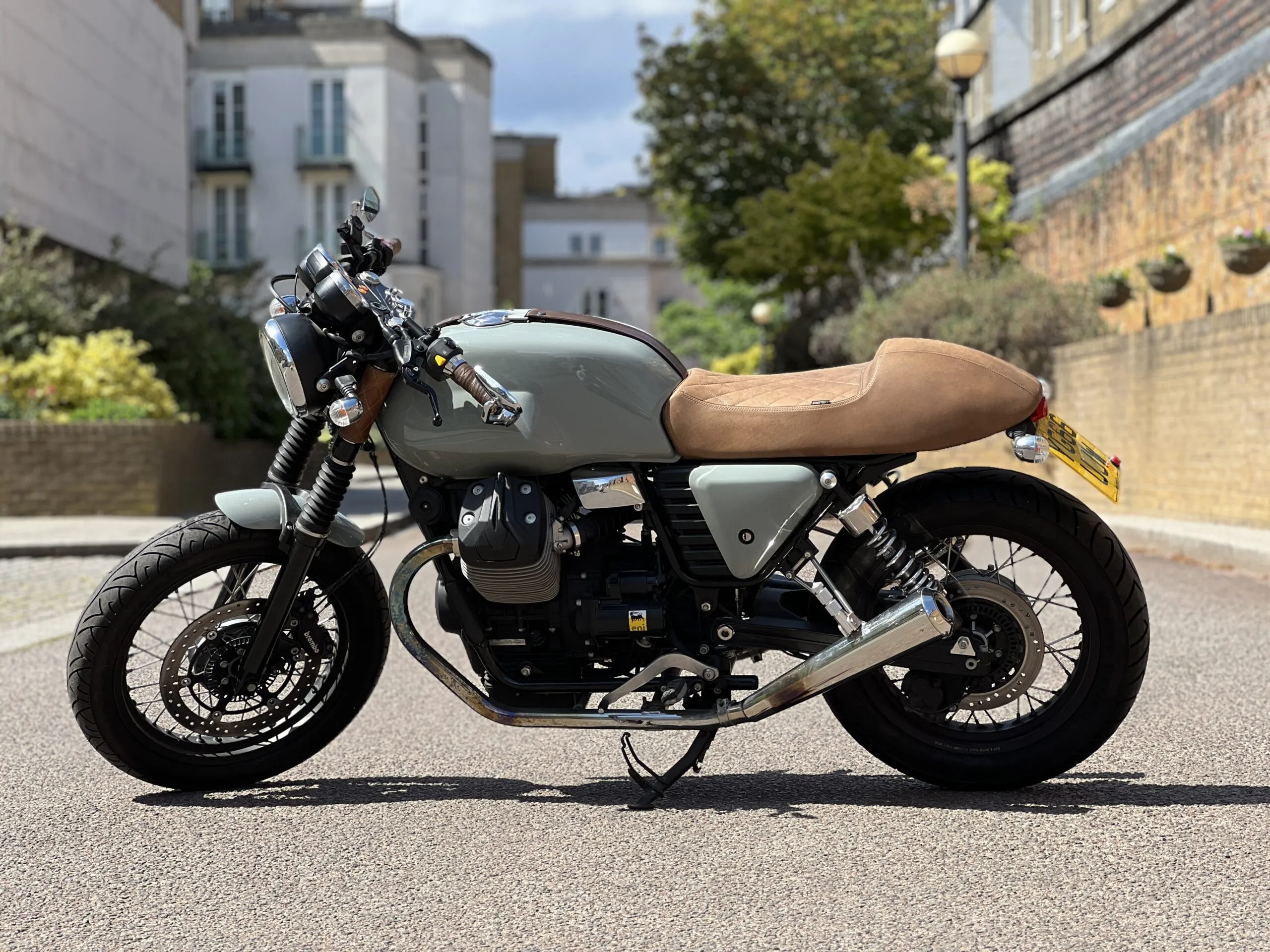 • Bespoke tan seat – café racer silhouette with plush comfort